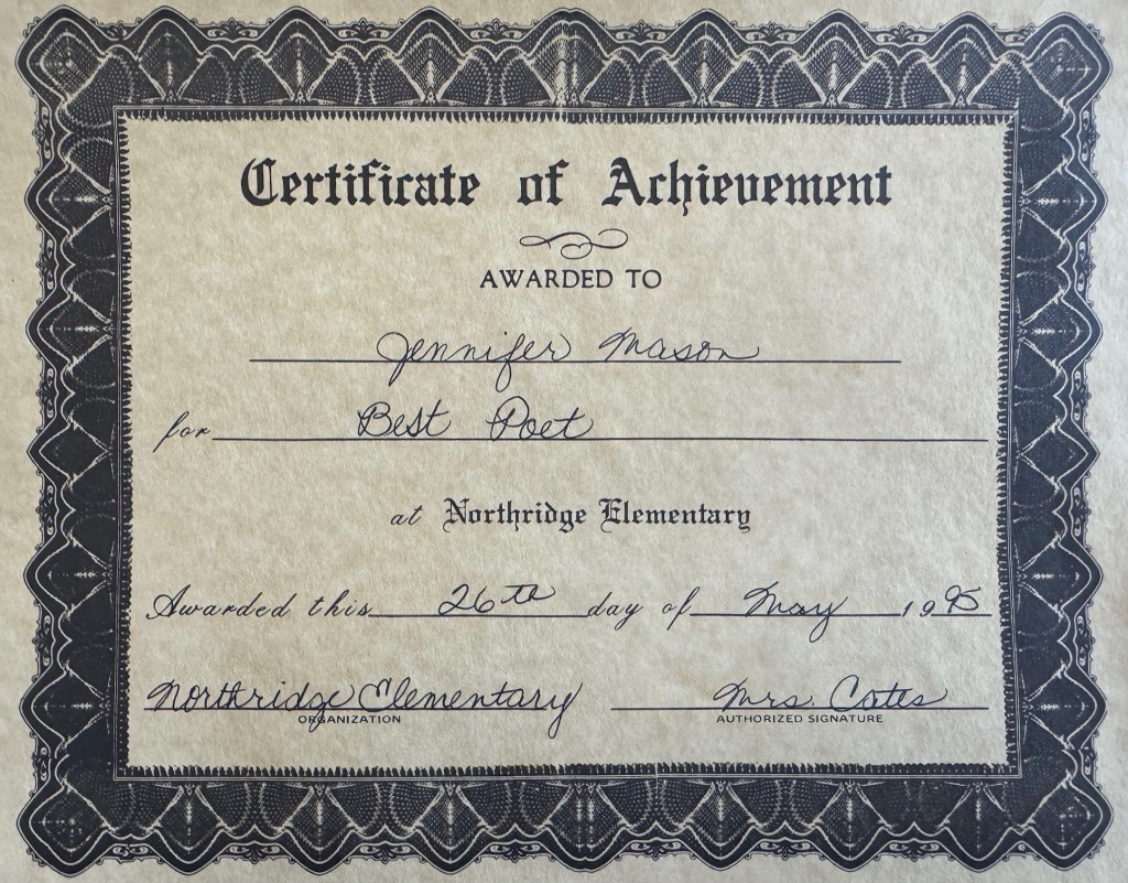 Way back in 1994-95, I was a fairly carefree fourth grader, enjoying the latest lesson from my dear teacher, Mrs. Linda Cates. One day, she read aloud to our class what I remember to be a lovely collection of poetry. When she was finished, she challenged us to take what we’d just heard and BE INSPIRED! She told us to write a poem of our own. That was the assignment.